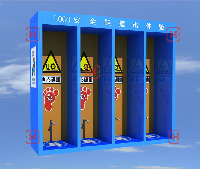 1、安全鞋撞击体验设置为四人用配备遥控装置,尺寸一般为3500*1000*2500mm,可根据现场实际尺寸调节。