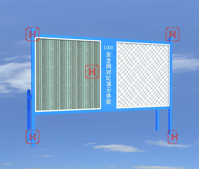 通过合格与不合格密目式安全网的对比展示,让体验人员从视觉、触觉上更直观的了解对安全网的材质、目数等的要求,懂得安全网在高空作业时防止人或物坠落而起到的关键作用。